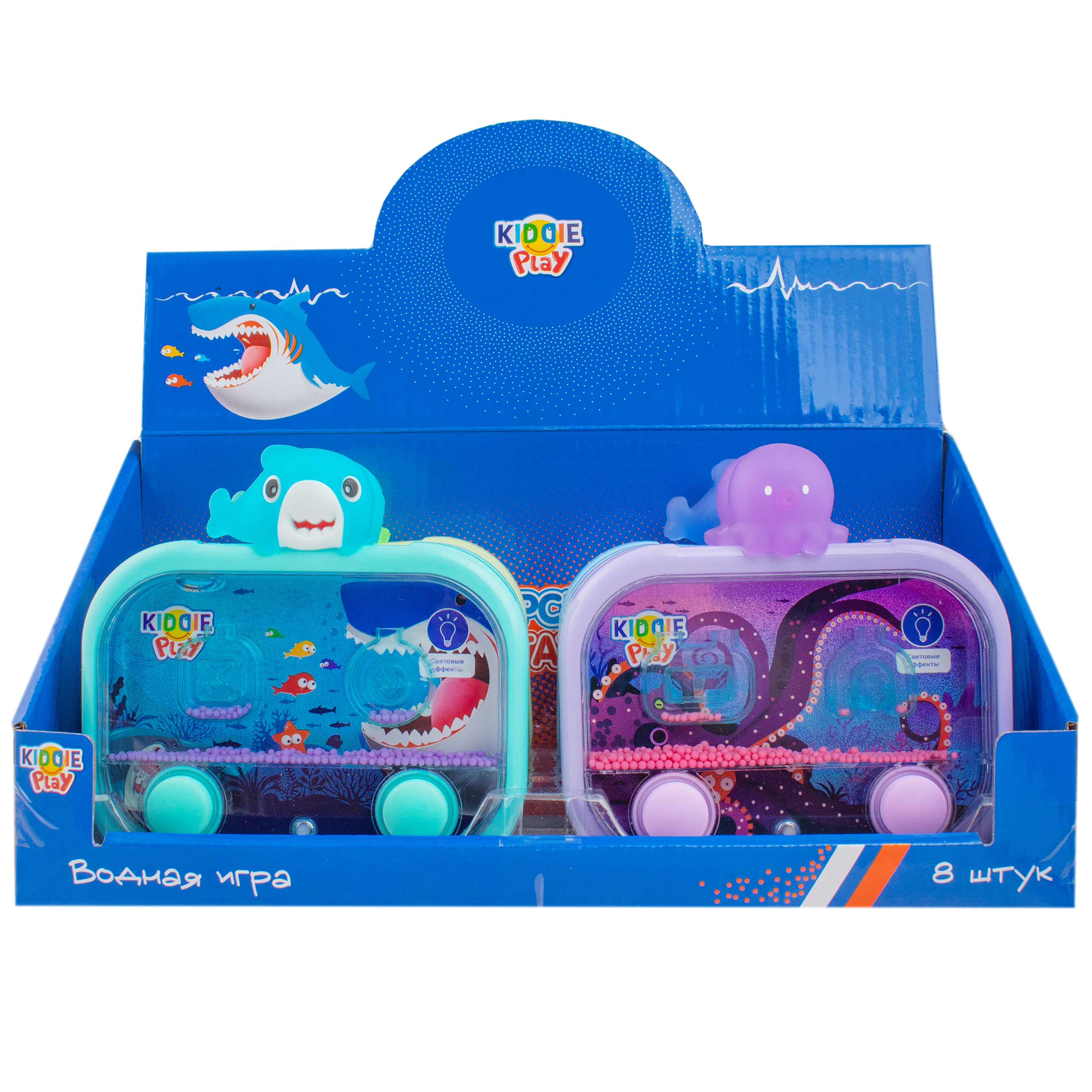 Яркий и красочный водный тетрис ""Морские животные"" от KiddiePlay станет отличным подарком для ребенка! Эта игрушка позволяет погрузиться в мир, где логика встречается с весельем, а водные элементы добавляют свежести и динамики. • Игрушка имеет оригинальный дизайн – выполнена в виде экрана с двумя приятными на ощупь кнопками и очаровательной акулой сверху; • Тетрис имеет простые правила: нажимайте на кнопки и потоком воздуха мячики будут подбрасываться вверх, задача игрока попасть мячами в корзинки; • Перед началом игры вытащите изолятор на задней части экрана, нажмите на кнопку и магическим образом тетрис начнет светиться; • Взаимодействие с игрушкой снимает напряжение, развивает мелкую моторику и логическое мышление; • Игрушка имеет небольшой размер, что позволяет ее удобно брать с собой в путешествие или на прогулку; • Играйте с друзьями или семьей и узнайте, кто из вас лучший стратег! • Тетрис представлен в ассортименте – собери всю коллекцию игрушек! Характеристики: • Рекомендованный возраст: 3+