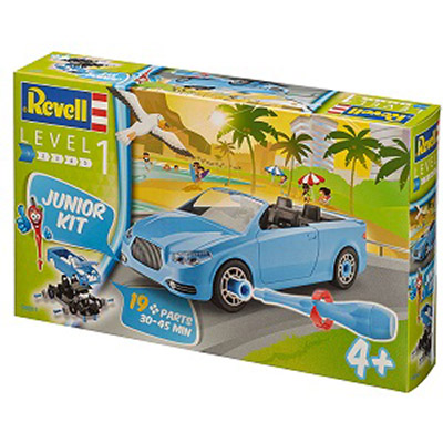 Абсолютно новую линейку сборных моделей представила компания Ревелл в этом году. Создана она специально для самых юных моделистов, которые делают свои первые шаги в этом хобби. Все детали моделей линейки Junior kit выполнены из пластика и уже окрашены. Ребенку остается лишь собрать их. Клеить детали не нужно, они стыкуются при помощи специальных элементов. Они легко вкручиваются при помощи пластиковой отвертки, которая входит в набор. Колеса машинки вращаются. Двери и капот открываются. Все детали выполнены из прочного пластика. Поэтому после сборки модели ребенок сможет использовать ее как обычную игрушку. Кроме того он всегда сможет разобрать машинку и попытаться собрать ее заново за меньшее время. Сборка модели поможет развить мелкую моторику рук, познакомит с техническим творчеством и обучит ребенка работе с простейшими инструментами. Используя детали из этого набора, ребенок сможет собрать голубой спортивный кабриолет. В набор включены наклейки для корпуса машинки. Модель состоит из 19 деталей и 24 соединительных элементов. Время сборки от 30 до 45 минут. Длина модели в собранном виде 22 сантиметра. Модель рассчитана на детей в возрасте от 4 лет.