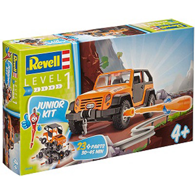 Абсолютно новую линейку сборных моделей представила компания Ревелл в этом году. Создана она специально для самых юных моделистов, которые делают свои первые шаги в этом хобби. Все детали моделей линейки Junior kit выполнены из пластика и уже окрашены. Ребенку остается лишь собрать их. Клеить детали не нужно, они стыкуются при помощи специальных элементов. Они легко вкручиваются при помощи пластиковой отвертки, которая входит в набор. Колеса машинки вращаются. Двери открываются, крыша снимается. Все детали выполнены из прочного пластика. Поэтому после сборки модели ребенок сможет использовать ее как обычную игрушку. Кроме того он всегда сможет разобрать машинку и попытаться собрать ее заново за меньшее время. Сборка модели поможет развить мелкую моторику рук, познакомит с техническим творчеством и обучит ребенка работе с простейшими инструментами. Используя детали из этого набора, ребенок сможет собрать джип. В набор включены наклейки для корпуса машинки. Модель состоит из 23 деталей и 18 соединительных элементов. Время сборки от 30 до 45 минут. Длина модели в собранном виде 21,5 сантиметра. Модель рассчитана на детей в возрасте от 4 лет.