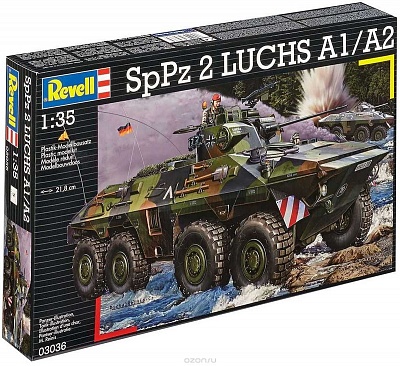 Сборная модель немецкой разведывательной бронемашины Luchs A1/A2. Комплект состоит из пластиковых деталей, которые необходимо отделить от литников, склеить и покрасить. Для этого вам понадобится клей для пластика, а также акриловые или эмалевые краски Ревелл. Все эти расходные материалы приобретаются отдельно. Данную разведывательную машину начали использовать в Бундесвере в 1975 году. Всего было произведено 408 машин. В 1985 году появился обновленный вариант - Luchs А2, получивший современные приборы ночного видения. Вооружение Luchs состояло из пушки 20 мм и пулемета 7,62 мм. Машина была способна преодолевать водные преграды благодаря наличию задних винтов и волнорезу. Масштаб модели 1:35 Длина модели 218 мм Количество деталей 224 Рекомендуется для детей от 12 лет.