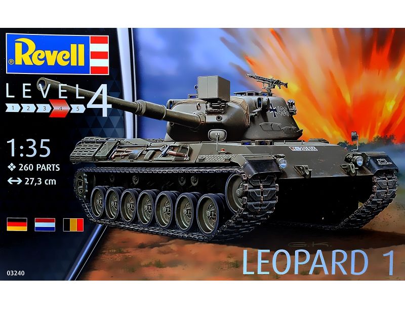 Сборная модель немецкого танка Leopard 1. Леопард являлся основным боевым танков вплоть до 1980 года. До сих пор состоит на вооружении армий ряда стран. Детали модели изготовлены из пластика. Их необходимо самостоятельно собрать и склеить. Затем собранную модель необходимо будет окрасить. Для этого рекомендуется использовать клей и краски Ревелл. Все расходные материалы приобретаются отдельно. В данный набор они не входят. Масштаб модели 1/35 Длина модели в собранном виде: 27 сантиметров Количество деталей: 260 Модель рекомендуется для взрослых и детей в возрасте от 12 лет.