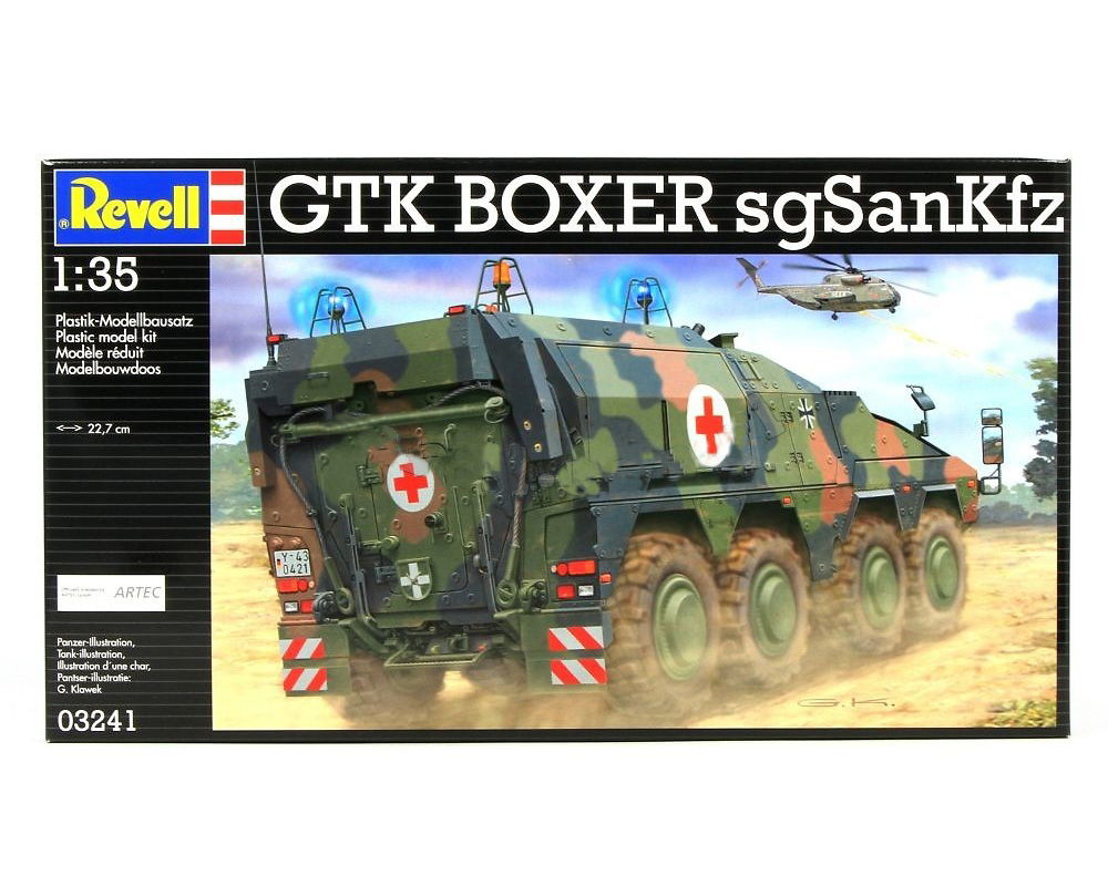 Бронетранспортер GTK Boxer sgSanKfz - это бронированая машина для оказания экстренной помощи. Медицинский транспорт вмещает в себя семь тяжело больных или раненых солдат. А для защиты машина оснащена 76 миллиметровым гранатометом. Иметь такую модель в коллекции — мечта любого моделиста. Поэтому компания Revell выпустила уменьшенную модель знаменитого бронетранспортера. Она полностью соответствует оригиналу. Даже в самых незначительных деталях. В дизайне машины нет никаких недочетов. Длина этого бронетранспортера 227 мм. А количество частей, из которых она состоит — 224! Модель рекомендуется детям от 12 лет и выше.