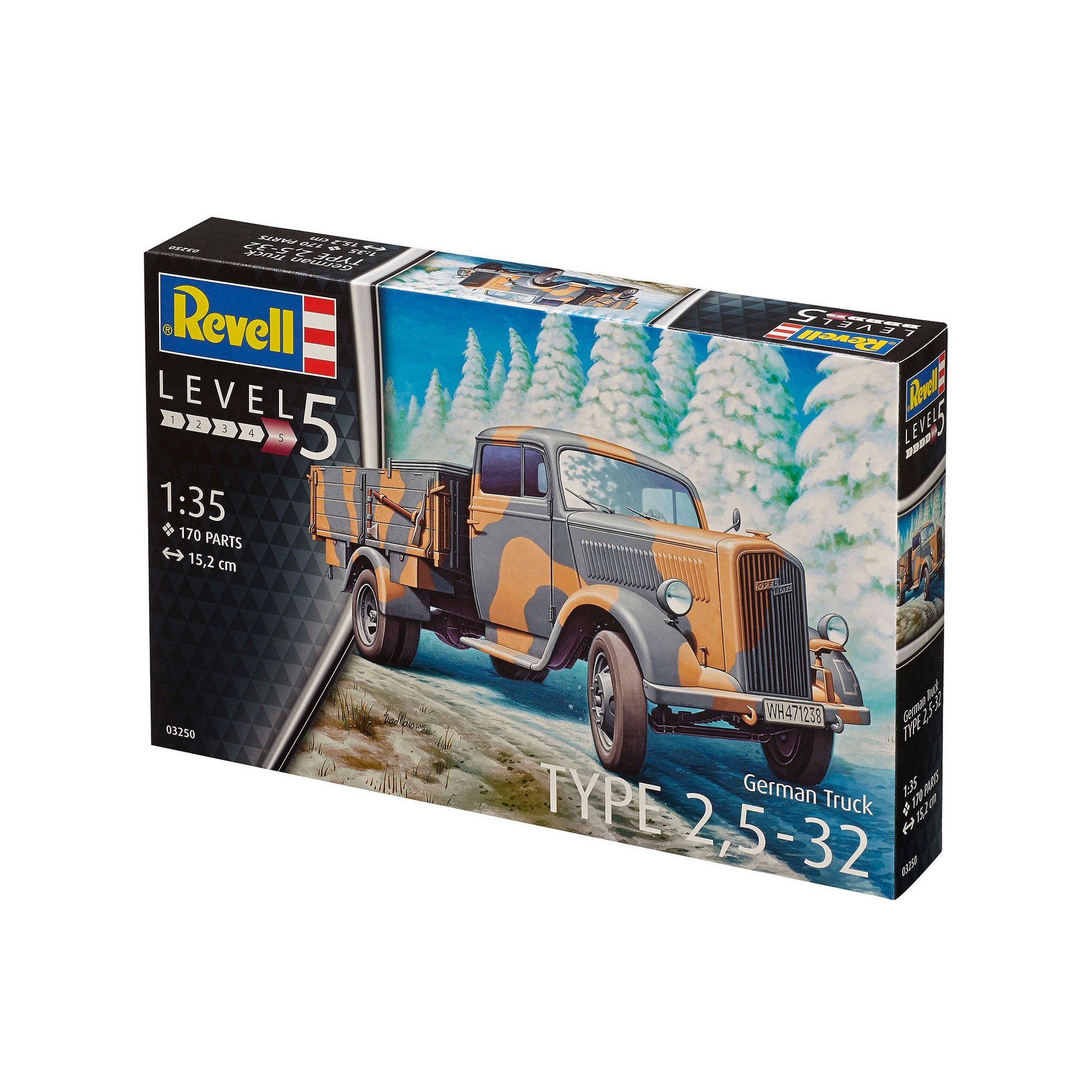 Сборная модель немецкого грузовика Type 2,5-32 времен Второй мировой войны. Все детали изготовлены из пластика. Для их сборки необходимо использовать клей для пластика. Затем модель необходимо будет покрасить. Рекомендуем использовать акриловую или эмалевую краску от Ревелл. Все расходные материалы приобретаются отдельно. В этот набор они не включены. Масштаб модели 1/35 Длина модели в собранном виде: 15 сантиметров Количество деталей: 170 Модель рекомендуется для взрослых и детей в возрасте от 14 лет.