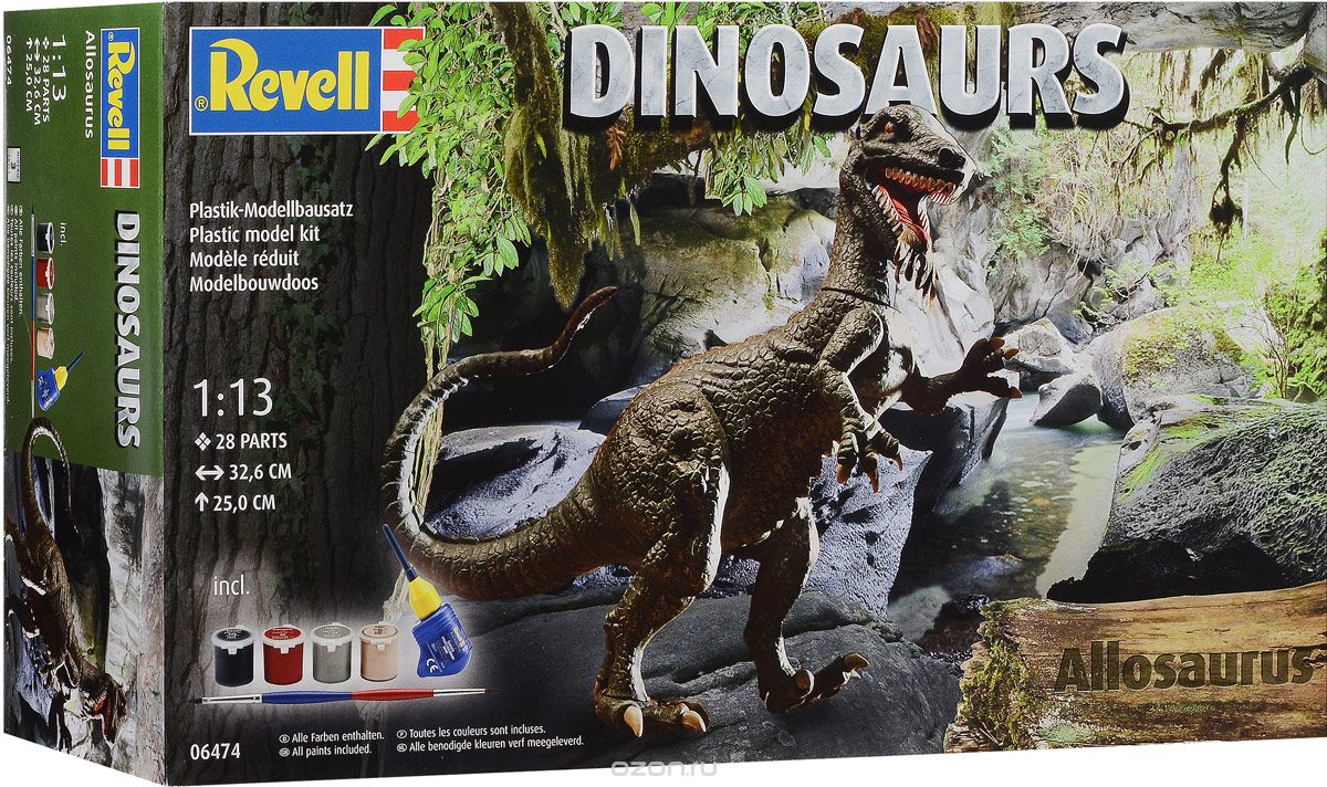 Новая линейка сборных моделей от компании Ревелл познакомит вашего ребенка с динозаврами, а также техническим творчеством. Аллозавр – один из представителей данной серии моделей. Все его детали выполнены из пластика. Они имеют специальные зажимы, которые позволят собрать модель без склеивания. Но для лучшей прочности рекомендуется использовать клей для пластика. После сборки динозавра необходимо самостоятельно покрасить. В собранном виде Аллозавр достигает высоты в 25 сантиметров. Модель состоит из 28 деталей. Масштаб модели - 1/13. В набор уже включены 4 банки с акриловой краской, кисточка и клей для пластика. Этих расходных материалов будет достаточно для сборки данного динозавра. Они не станут лишними и при сборке других моделей. Модель рекомендована для взрослых и детей в возрасте от 10 лет.