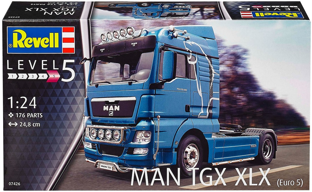 Седельный тягач MAN TGX XLX представлен компанией Revell в виде сборной модели из пластика. Для получения готовой модели необходимо самостоятельно собрать и склеить детали. Затем модель необходимо будет покрасить. Для работы рекомендуется использовать клей и краски Ревелл. Эти расходные материалы в набор не входят и приобретаются самостоятельно. Масштаб модели 1/24 Длина модели в собранном виде: 24 сантиметров Количество деталей: 176 Модель рекомендуется для взрослых и детей в возрасте от 14 лет.
