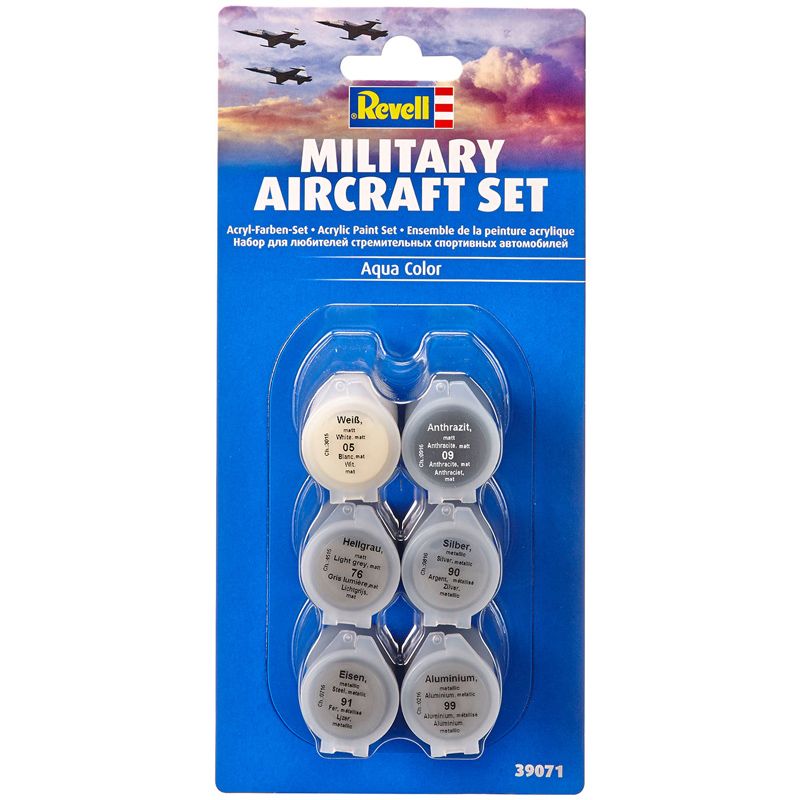 Новые наборы базовых красок от Ревелл отлично подойдут всем начинающим моделистам. В каждый набор включены 6 баночек с акриловой краской емкостью 5 мл. Краска отлично разбавляется обычной водой или фирменным растворителем Revell для акрила. При использовании с аэрографом краску рекомендуется разбавлять до консистенции молока. Данный набор предназначен в первую очередь для покраски моделей военной авиации. В него включены краски следующих цветов: White matt Anthracite matt Light gray matt Silver metallic Steel metallic Aluminum metallic Набор рекомендован для моделистов в возрасте от 8 лет.