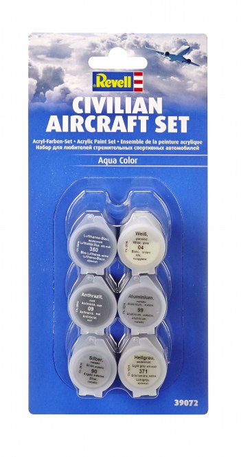 Новые наборы базовых красок от Ревелл отлично подойдут всем начинающим моделистам. В каждый набор включены 6 баночек с акриловой краской емкостью 5 мл. Краска отлично разбавляется обычной водой или фирменным растворителем Revell для акрила. При использовании с аэрографом краску рекомендуется разбавлять до консистенции молока. Данный набор предназначен в первую очередь для покраски моделей гражданской авиации. В него включены краски следующих цветов: White gloss Anthracite matt Silver metallic Aluminum metallic Dark blue silk Light gray silk Набор рекомендован для моделистов в возрасте от 8 лет.