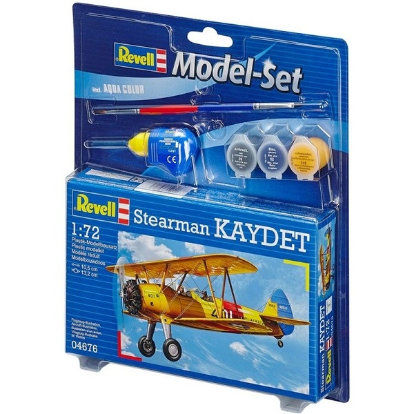 Сборная модель самолета Stearman Kaydet. Набор создан для начинающих моделистов. Помимо самой модели, он включает в себя базовые краски, клей и кисточку. Краска в комплекте акриловая. Может быть разбавлена обычной водой. Всего в наборе 3 цвета. Дополнительные краски приобретаются отдельно. Модель собирается из 29 пластиковых деталей. Длина модели 10,5 сантиметров. Размах крыльев 13,2 см. Масштаб 1:72 Декаль для самолета: Stearman N2S-2 Kaydet, Naval Air Station Corpus Christi, Texas 1943 Для детей от 10 лет.