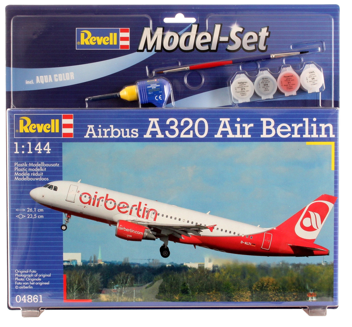Сборная модель пассажирского лайнера Airbus A320 в ливрее авиакомпании AirBerlin. Детали изготовлены из пластика. Сама модель выполнена в масштабе 1 к 144. В данный набор помимо самой модели входят базовые акриловые краски, клей и кисточки. Этих материалов вполне хватит для сбора первой стендовой модели. Масштаб: 1:144 Количество деталей: 60 Длина: 261 мм Размах крыльев: 235 мм Клей и краски в комплект не входят.