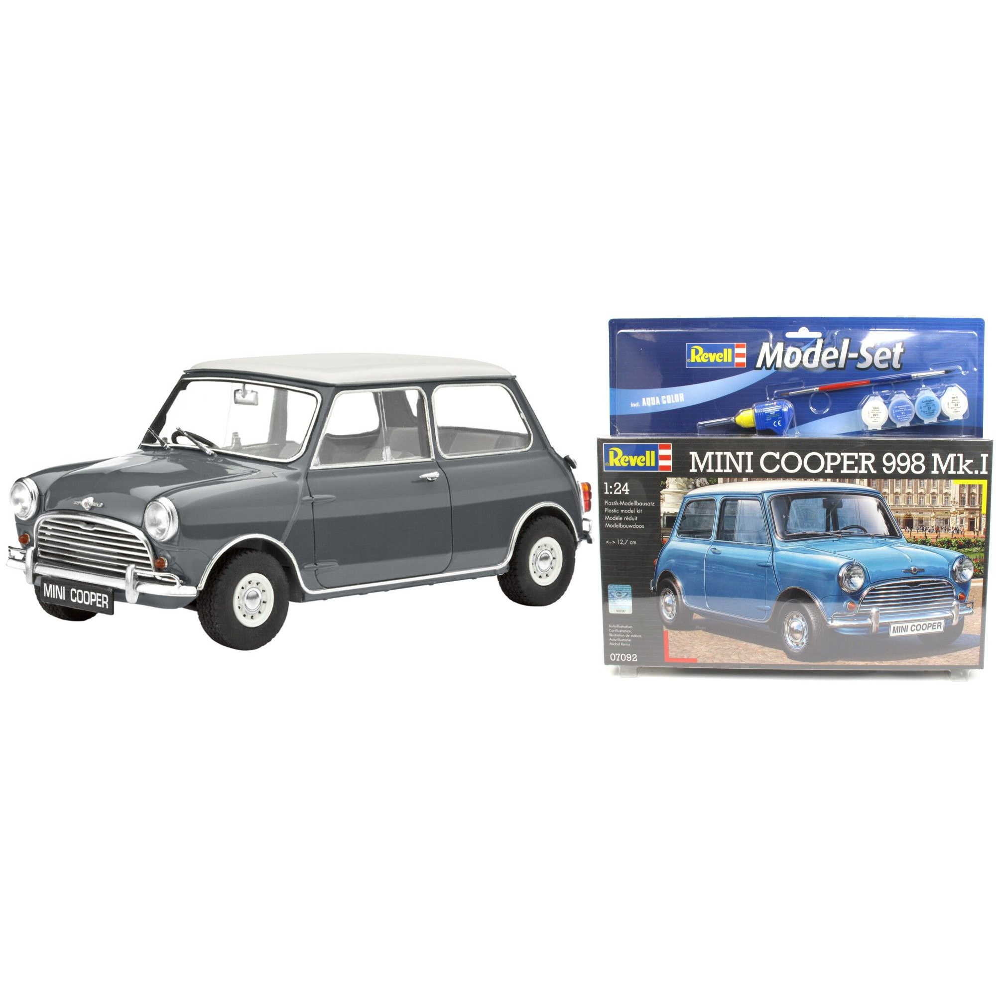 Сборная модель автомобиля Mini Cooper 998 Mk.I в масштабе 1:24. Длина модели после сборки 12,7 сантиметров. В наборе 126 деталей. В том числе элементы из прозрачного пластика, резиновые шины и хромированные детали. У модели открываются багажник и капот. Двери не открываются. В набор помимо деталей входят акриловые краски, клей и кисточка. Всего в комплекте 4 базовых цвета. Остальные краски необходимо докупить. Инструменты тоже приобретаются отдельно. Декали с номерами в комплекте. Для взрослых и детей от 14 лет.