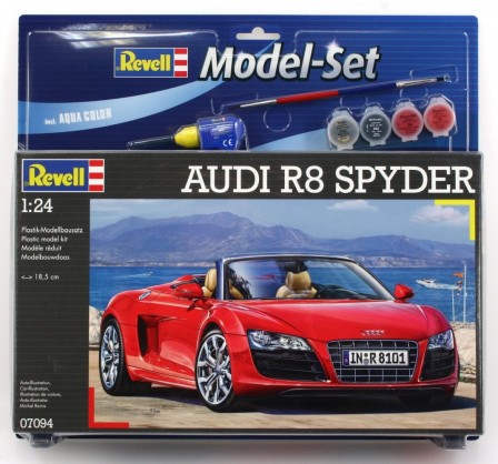 Родстер на базе Audi R8. Впервые был представлен в 2009 году на Франкфуртском автосалоне. На родстере была убрана уже ставшая «визитной карточкой» R8 панель на боку автомобиля, отличающаяся по цвету от остального кузова машины. Длина модели 185 мм Масштаб: 1:24 Количество элементов: 126 Для детей от 10 лет. В набор входят базовые краски, клей и кисточка.