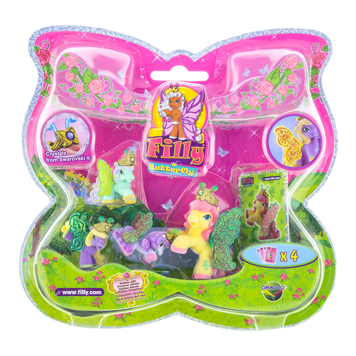 Набор игровой Filly Лошадки-бабочки с блестящими крыльями просто восхитителен. В него входят четыре маленькие лошадки с яркими блестящими крылышками. У каждой лошадки на голове надета золотистая корона, украшенная драгоценным камнем. Собери всю коллекцию лошадок-бабочек и играй в них вместе со своими подругами! В комплект набора входит: 4 лошадки, 4 карточки каждого персонажа, а также брошюрка с описанием других героев этой серии. Набор продается в красочной блистерной упаковке формы бабочки, окантованной по краю блестящей полоской.