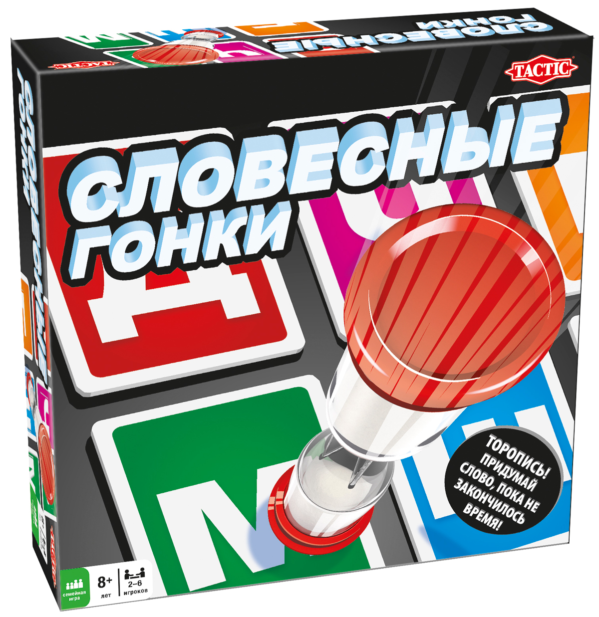 Торопись! Придумай слово, пока не закончилось время! Переверни песочные часы, разложи карточки с буквами и скорее называй слово нужной категории! Песочные часы переворачивают каждый раз, когда звучит новое слово. Поэтому ты никогда не знаешь, сколько времени у тебя будет для следующего хода... "Словесные гонки" не дадут расслабиться в веселом круговороте букв и слов.