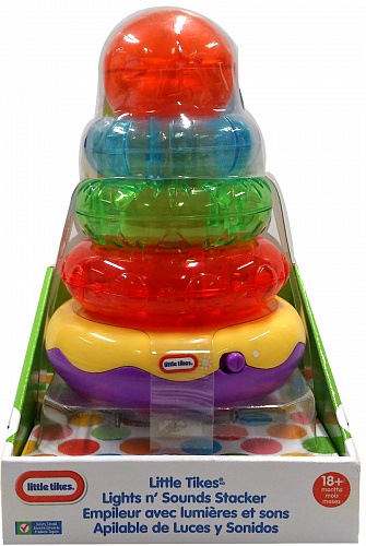 Эта детская пирамида из колец поможет развить у ребёнка ловкость, хорошие двигательные навыки, тактильные ощущения, ведь каждое кольцо имеет свою особую текстуру. Дети будут с удовольствием играть с яркими кольцами, которые можно складывать в пирамиду. Также данная пирамида обладает световыми эффектами, звуками и музыкой, которые делают игру с ней еще веселее. Данная игрушка прекрасно развивает моторику малыша. Нажав на шар один раз, малыш увидит огоньки и услышит звуки. Нажав ещё раз, он услышит одну из трёх песенок. Если нажать на шар во время воспроизведения песни, она переключится на следующую. На основании пирамиды имеется выключатель. Для работы необходимы 2 щелочные батарейки размера АА (не входят в набор).