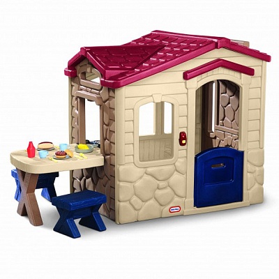 Этот очаровательный домик имеет дополнительную зону для пикника. Он станет идеальным местом для многочасовых увлекательных игр! Пусть Игровой домик «Пикник на Террасе» от Little Tikes станет прекрасным поводом для ваших детей побыть на свежем воздухе и поупражнять своё воображение. В комплекте столик для пикников и две табуретки, а также игрушечная еда. Имеется волшебный дверной звонок с 6 различными звуками. Детальный интерьер, литая «черепичная» крыша, высокий дверной проём для подрастающих детей, большие окна, голландская дверь (из двух частей), раковина и плита/ставни.