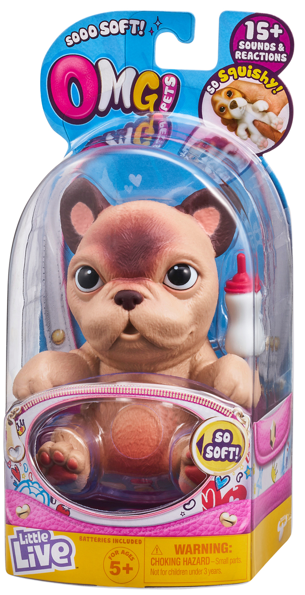 Новинка! OMG Pets! – новые питомцы Little Live – сквиши-щенки! Очень милые и мягкие – совсем как настоящие! Чудо-питомцы умеют проявлять эмоции: будут радостно тявкать, если их погладить по голове или покормить из бутылочки, и будут огорчаться, если их надолго оставить без внимания. Волшебная бутылочка в комплекте подскажет пол щенка! Линейка представлена 6 породами щенков: пудель, немецкая овчарка, французский бульдог, бигль, хаски и лабрадор. В КОМПЛЕКТЕ: 1 Чудо-питомец, 1 Бутылочка, 3 Батарейки типа LR44, 1 Свидетельство о рождении, 1 Инструкция.