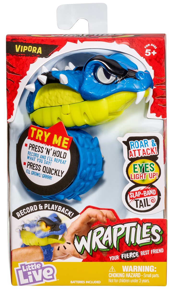 Новинка! Интерактивная игрушка Wraptiles Рептилия Гадюка – специальная серия для мальчиков. Самые надежные зубастые друзья! Они цепко держатся на твоей руке. Цвет загоревшихся глаз подскажет тебе, в каком они настроении. С ними никогда не будет скучно: они умеют разговаривать на своем «рептилийском» языке, могут записать любую речь и воспроизвести её в манере Wraptiles! В линейке 3 разновидности рептилий: Крокодил, Ящерица, Гадюка. В комплекте: 1 интерактивная рептилия, 1 инструкция, 2 батарейки типа AAA/LR03.