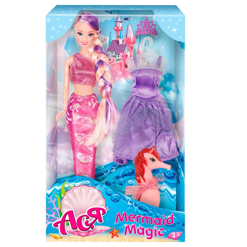 Кукла Ася «Волшебная Русалочка» – очаровательная блондинка, которая из русалочки способна превратиться в обычную куклу. Для этого стоит всего лишь сменить одежду! В наборе малышка найдет фиолетовое платье, туфли на высоком каблуке, диадему, хвостик русалки, фигурку морского конька.