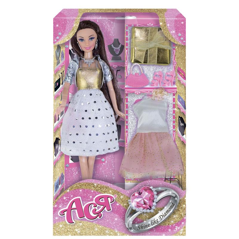 Милая брюнетка с роскошными длинными волосами и нежным макияжем выглядит очень стильно в своем образе. Платье с золотистым топом, юбкой в серебристый горох, а поверх укороченный серебристый пиджачок выглядят очень празднично. Образ дополняют серебристые колье и серьги, розовые сумочка и туфли. Также в комплекте есть нежно-розовое комбинированное платьице, а также подарок для подружки Аси в красивой золотой упаковке. Переодевая куклу, комбинируя разные части гардероба и аксессуары, девочки почувствуют себя настоящими стилистами!