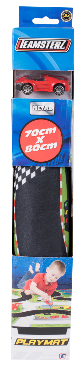Комплект состоит из большого красочного игрового коврика и одной небольшой цельнометаллической машинки с свободно вращающимися колесами. Мат размером 70х80 см представляет собой небольшой участок города с изображением улиц, домов и дороги для движения транспорта.
