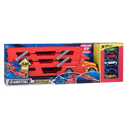 Игровой набор сделан в виде красного длинномерного трейлера для перевозки машинок, кузов которого разделен на 4 яруса раздвижных дорожек, соединенных шарнирами. В комплект включены 5 литых металлических машинок, которые подлежат хранению и транспортировке в автоперевозчике, а также участвуют в гонках.