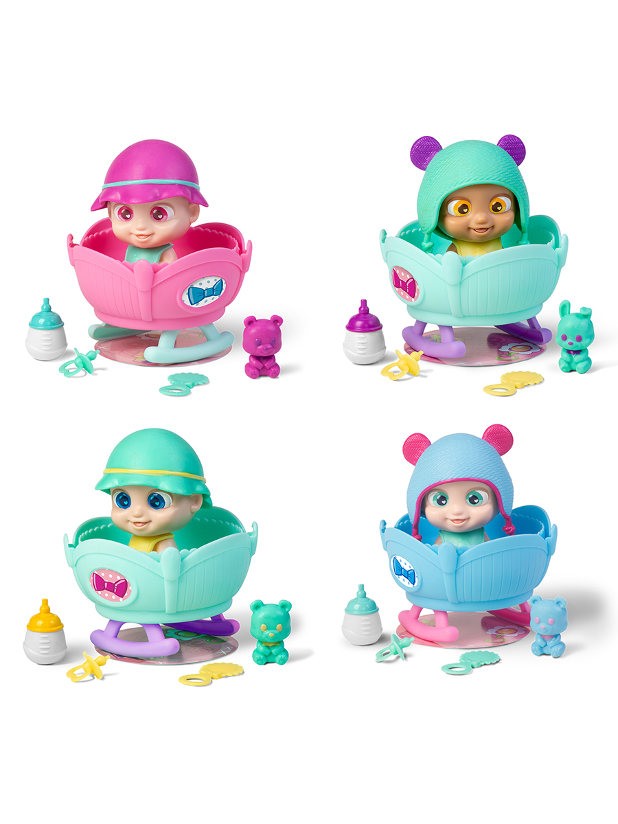 Интерактивные Пупсы-малыши Baby Buppies. Представляют собой малленькую игрушку-пупсика выс. 7 см, с подвижной головой. Продаются в упаковке в виде бутылочки для кормления, нижняя часть упаковки трансформируется в колыбельку. Мылыш умеет заразительно смеяться, если его потрясти, умеет хныкать и плакать, если его оставить без внимания и не играть в течение 2 мин., умеет пить из бутылочки - при кормлении будет издавать звуки довольного причмокивания. В комплекте бутылочка для кормления, которая на ярком солнечном свете проявит на боковой стороне первую букву имени Малыша. Кроме этого в комплект входят: питомец, шапочка, колыбелька, комплекте 3 вещи-сюрприза (соска, погремушка, слюнявчик), лист с наклейками и свидетельство о рождении. В коллекции 10 разновидностей малышей (отличаются цветом волос, глаз).