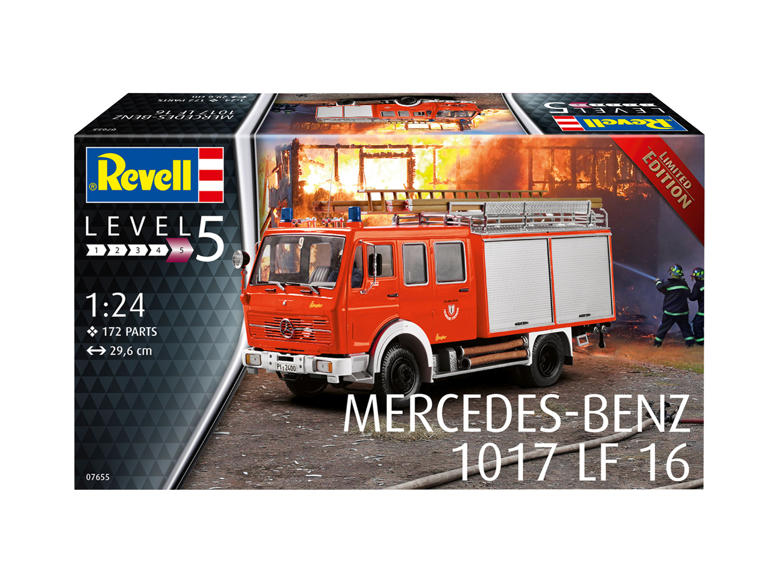 Пожарная машина LF16 установлена на шасси Mercedes-Benz 1017, оснащенный 6-цилиндровым дизельным двигателем с турбонаддувом мощностью 172 л.с. Масштаб 1/24. 172 детали. Длина 29,6 см. Возраст: от 13 лет