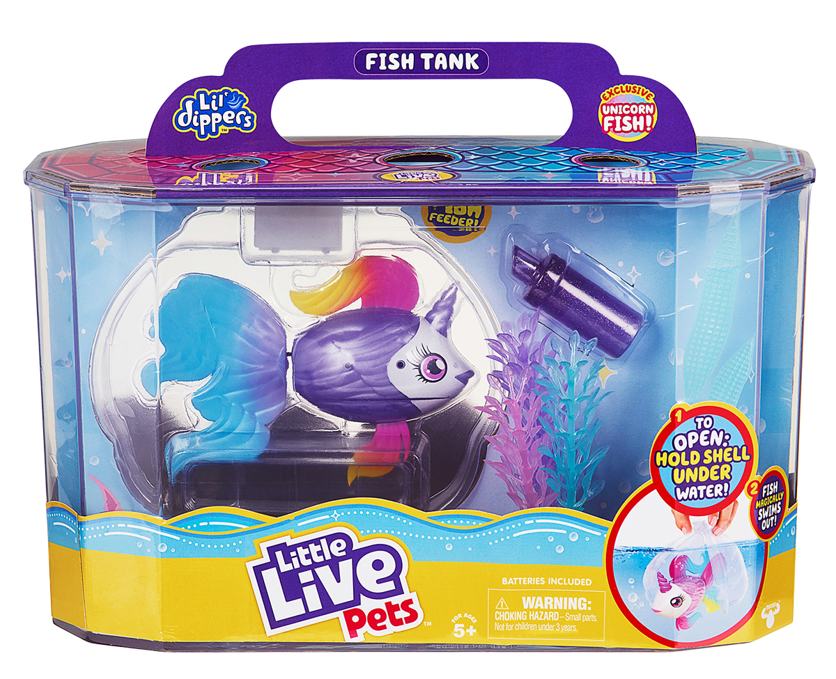 Набор "Рыбка-единорожка в аквариуме Lil' Dippers" - чудо аквариумистики! Залей аквариум водой, погрузи туда прозрачный контейнер с рыбкой, и на твоих глазах единорожка, расправит хвост и выплывет с свою родную стихию! Чтобы рыбка не проголодалась, ее можно кормить из специальной кормушки в комплекте. Поднеси ее к стенке аквариума, и рыбка к тебе приплывет!