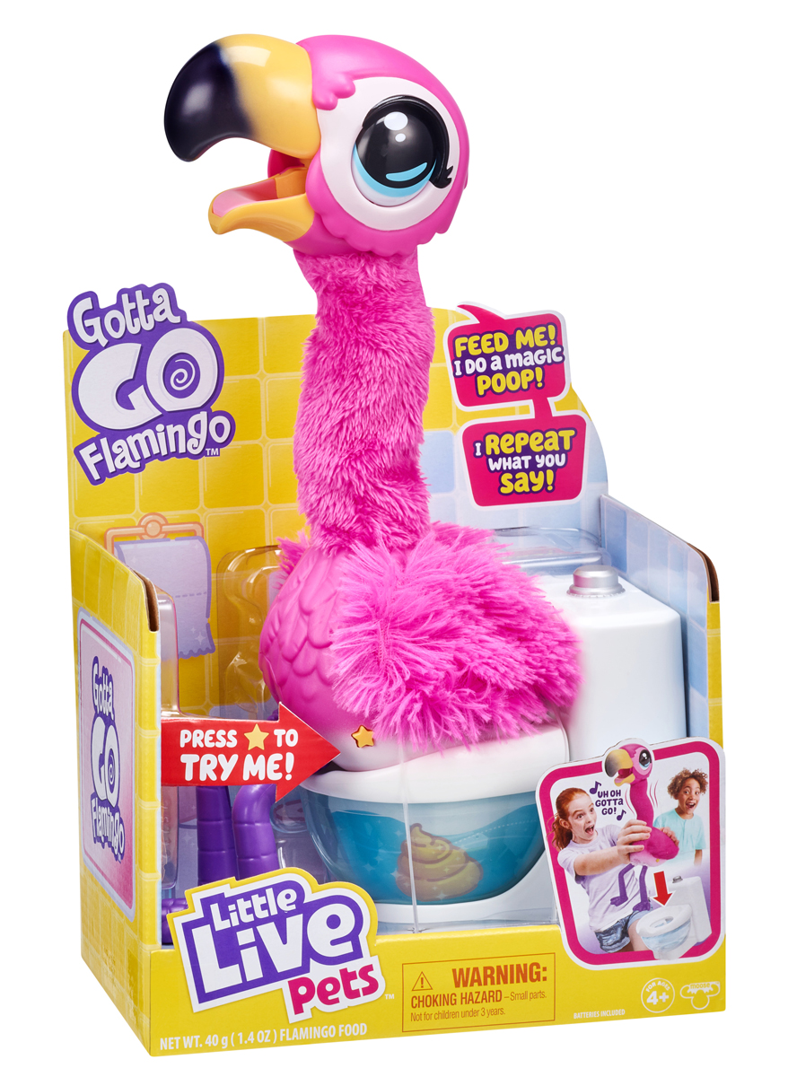 Gotta Go Фламинго - это забавный друг, который наглядно покажет ребенку, как происходит естественный физиологический процесс: питомца нужно покормить, усадить "на горошок" и наблюдать, что же произойдет... У питомца есть специальный пакетик с едой и ложка-контейнер для хранения еды. Фламинго умеет петь песню Uh Oh и "пританцовывать", задорно покачивая головой на длинной шее. Также игрушка имеет веселые звуковые эффекты (когда фламинго ест, какает или заспает). Есть интерактивные функции (отвечает на реакцию ребенка), а также функция Try-Me. Вкомплекте: 1 фламинго, 1 игрушечный унитазик, 1 ложка, 1 еда фламинго, 1 инструкция, 3 демобатарейки АА.