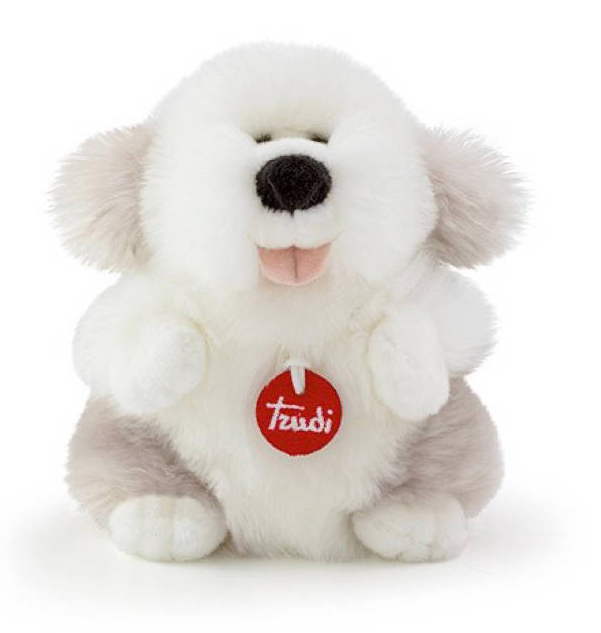 Забавный мохнатый щенок серо-белого окраса, очень похожий на реальную породу Бобтейла. Игрушка сидит на задних лапках, высунув язык, ожидая очередного угощения.