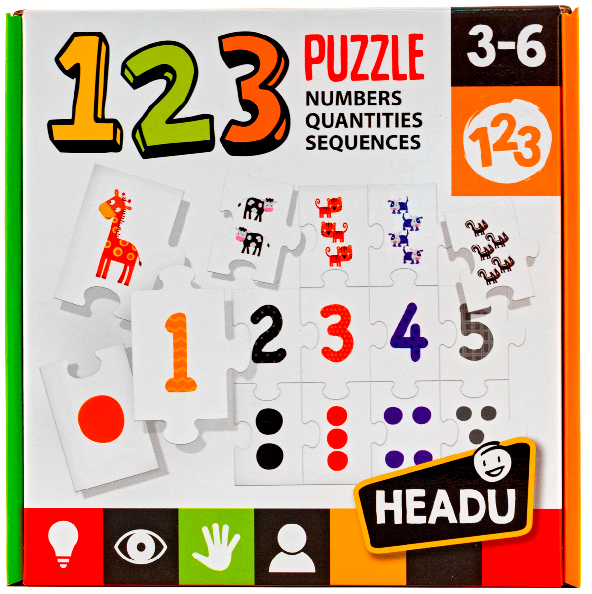 Обучение счету разными способами: в вертикальном направлении дети могут ассоциировать элементы от 1 до 9 с соответствующими величинами; в горизонтальном направлении они размещают числа и количества в нужной последовательности. В комплекте: пазл-счет (60 х 30 см), состоящий из 27 элементов.