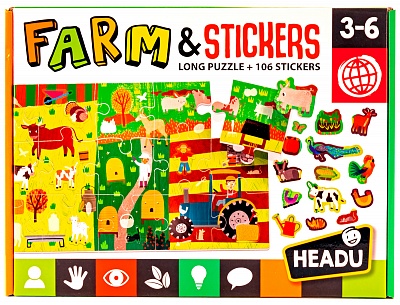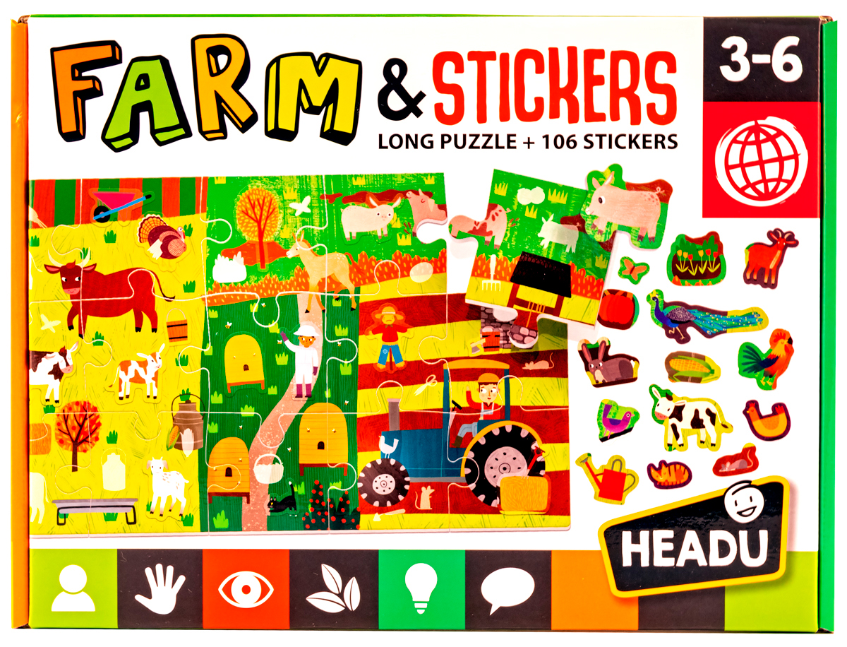 Большой пазл-ферма с более чем 100 сменными наклейками. Соберите детали, изучите форму каждого предмета, найдите соответствующую наклейку и поместите ее в нужное место! В комплекте: 1 большой пазл из 48 элементов; более 200 многоразовых стикеров.
