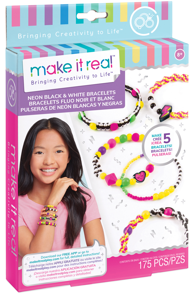 Кто сказал, что черно-белый и неон уже не в моде? С новым творческим набором от Make it real каждая девочка засверкает будто в неоновых лучах или в черно-белом кино, надев на запястье уникальный браслет, созданный по своему дизайну. Подобрав под настроение шнурок и дополнительные элементы, можно сделать украшение, приводящее в восторг окружающих. Состав: Эластичный и 3 сатиновых шнура, 167 разнообразных неоновых, черных и белых бусин, 2 шарма-бусины, пластиковая подставка-органайзер.