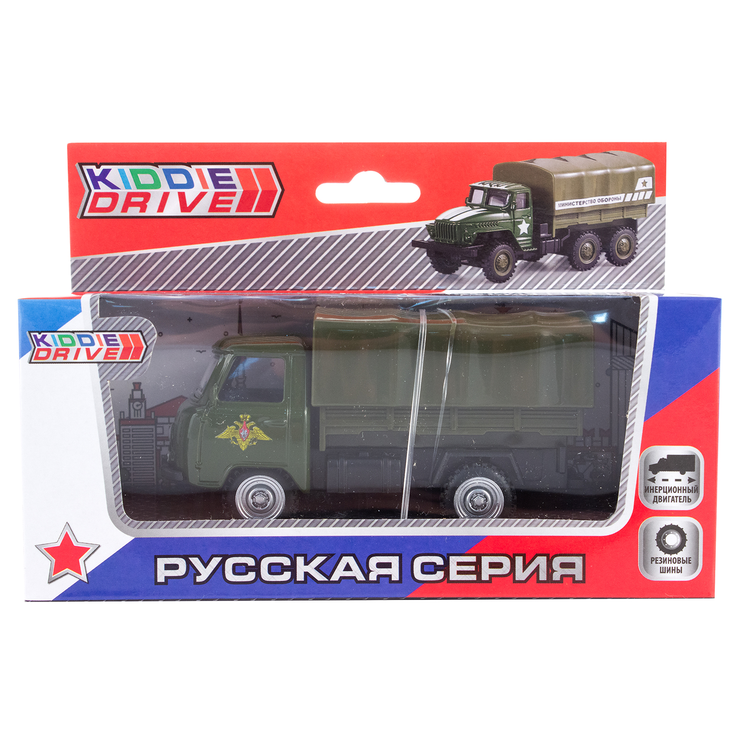 Классический милитари цвет, узнаваемый дизайн и высокая детализация – все это новая игрушка от KiddieDrive - автомобиль для перевозки личного состава! играйте вместе с KiddieDrive! • Игрушка оснащена инерционным механизмом, что позволяет ей легко ездить; • Игрушка имеет высокую детализацию; • Автомобиль выполнен в классическом зеленом военном цвете; • На двери автомобиля нанесен герб России; • Колеса машинки прорезинены и имеют достаточный диаметр для того, чтобы ребенок мог играть как дома, так и на улице; • Рекомендованный возраст: 3+