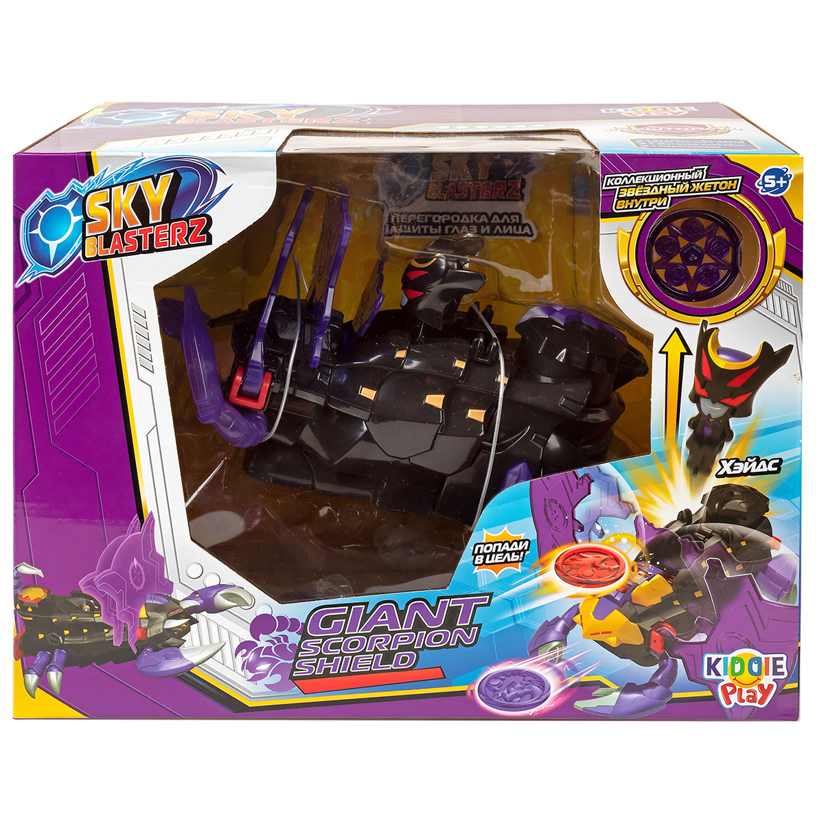 Боевой корабль Sky Blasterz в формате игрушки-стрелялки нового поколения с защитными щитами и фигуркой Хэйдса за штурвалом. Атаковать и защищаться можно одновременно: отстреливаясь жетонами-снарядами, а также успевать сдерживать удары противника при помощи суперщитов. Присоединяйся к воинам Sky Blasterz в одноименном мультсериале и следи за их захватывающими приключениями по поиску звёздных жетонов!