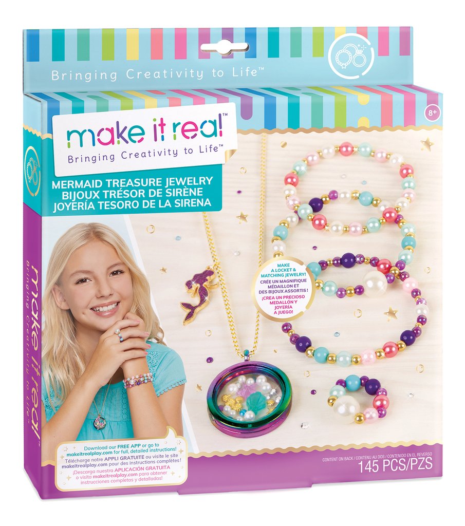 Уникальный набор с многочисленными аксессуарами для изготовления украшений поможет девочкам создать собственное модное ожерелье с подвеской-медальоном, а также два браслета с подвесками в виде русалки с золотыми и жемчужными бусинами по своему индивидуальному дизайну! Состав: 1 металл.брелок с магнитом и стеклом, 60 золотых пласт.бусин, 50 пласт.бусин, 45 пласт.жемчужин, 30 мини пласт.жемчужин и драг.камней, 1 шарм, плетеный хлопковый шнур, эластичнй шнур, пластиковая подставка