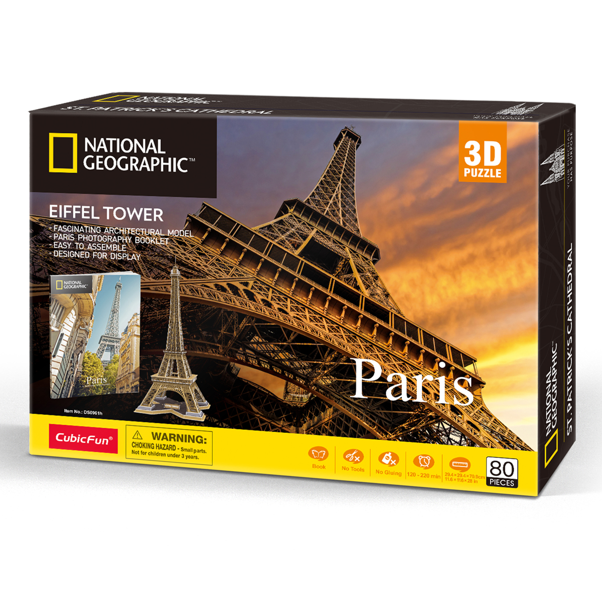 3D пазлы от лидирующей инновационной компании CubicFun - высокий уровень детализации, качество самих деталей (детали надежно крепятся между собой без дополнительной фиксации, создавая единую конструкцию), стильный дизайн, а также информационная и образовательная составляющая. Увлекательный 3D пазл достопримечательности Парижа –Эйфелева башня из серии National Geographic c уровнем сложности 5 из 6. Набор содержит 80 объёмных деталей, а размер готового сооружения составляет 29,4 х 29,4 х 70,9 см. Линейка National Geographic позволяет построить реалистичные достопримечательности в формате 3d пазла (с детальной инструкцией по сборке), а также фото-буклет страны из 28 страниц вдохновит на путешествия. Серия 3D пазлов National Geographic обладает красивым декором, воссоздает всемирно известные достопримечательности и шедевры архитектуры, повышает уровень концентрации, зрительно-моторной координации, вдохновляет на познание мира. 3D пазлы от CubicFun - это универсальный товар, удовлетворяющий потребности широкого круга потребителей: новый формат времяпровождения для детей, подростков и взрослых с интересным игровым процессом. Развиваются творческие навыки и концентрация к деталям. Различные уровни сложности помогут определиться с моделью как новикам, так и опытным моделистам. 3D пазлы CubicFun станут отличным подарком близкому человеку или себе для сборки дома или в дороге.