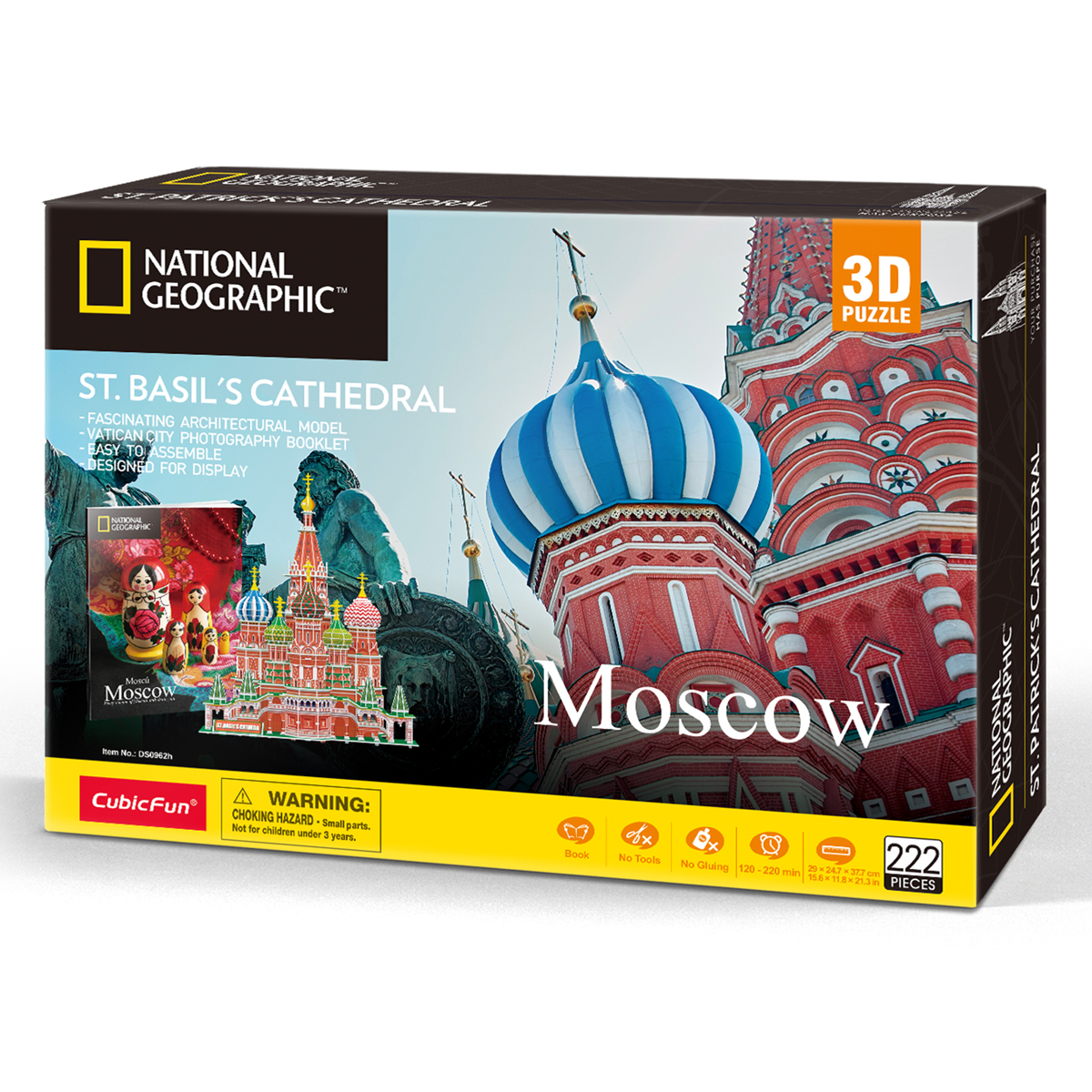 3D пазлы от лидирующей инновационной компании CubicFun - высокий уровень детализации, качество самих деталей (детали надежно крепятся между собой без дополнительной фиксации, создавая единую конструкцию), стильный дизайн, а также информационная и образовательная составляющая. Увлекательный 3D пазл московского Храма Василия Блаженного из серии National Geographic c уровнем сложности 5 из 6. Набор содержит 224 объёмных деталей, а размер готового сооружения составляет 24,7 х 29 х 37,7см. Линейка National Geographic позволяет построить реалистичные достопримечательности в формате 3d пазла (с детальной инструкцией по сборке), а также фото-буклет страны из 28 страниц вдохновит на путешествия. Серия 3D пазлов National Geographic обладает красивым декором, воссоздает всемирно известные достопримечательности и шедевры архитектуры, повышает уровень концентрации, зрительно-моторной координации, вдохновляет на познание мира. 3D пазлы от CubicFun - это универсальный товар, удовлетворяющий потребности широкого круга потребителей: новый формат времяпровождения для детей, подростков и взрослых с интересным игровым процессом. Развиваются творческие навыки и концентрация к деталям. Различные уровни сложности помогут определиться с моделью как новикам, так и опытным моделистам. 3D пазлы CubicFun станут отличным подарком близкому человеку или себе для сборки дома или в дороге.