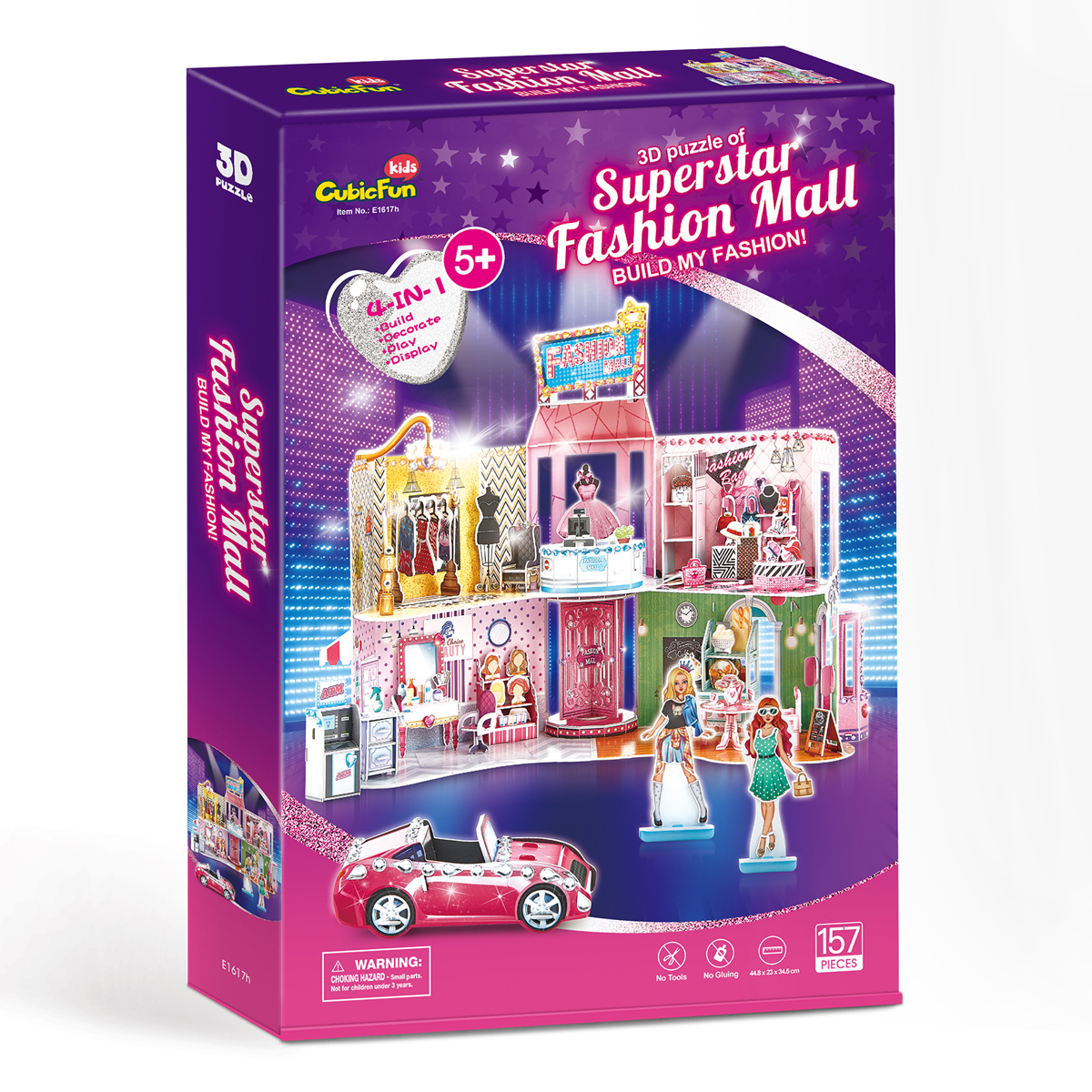 3D пазлы от лидирующей инновационной компании CubicFun - высокий уровень детализации, качество самих деталей (детали надежно крепятся между собой без дополнительной фиксации, создавая единую конструкцию), стильный дизайн, а также информационная и образовательная составляющая. 3D пазл «Торговый центр суперзвезды» из серии «Домики» c уровнем сложности 4 из 6. Набор содержит 157 объёмных деталей, а размер готового макета составляет 44,8х23х33,5 см. Серия «Домики» - это 3D пазлы с дополнительными игровыми элементами в виде мебели, миниатюрных фигурок, транспортом со средним уровнем сложности сборки. В комплекте 3D пазл с детальной инструкцией по сборке, многочисленные дополнительные игровые элементы, а также 3 листа с наклейками-стразами для декорации и 2 пары магнитных аксессуаров. 3D пазлы от CubicFun - это универсальный товар, удовлетворяющий потребности широкого круга потребителей: новый формат игры для детей, подростков и взрослых через знакомство с известными городами и достопримечательностями, развитие творческих навыков и внимания. Представлены с различными уровнями сложности, подходящими как любителям, так и профессиональным моделистам. 3D пазлы CubicFun станут отличным подарком близкому человеку.