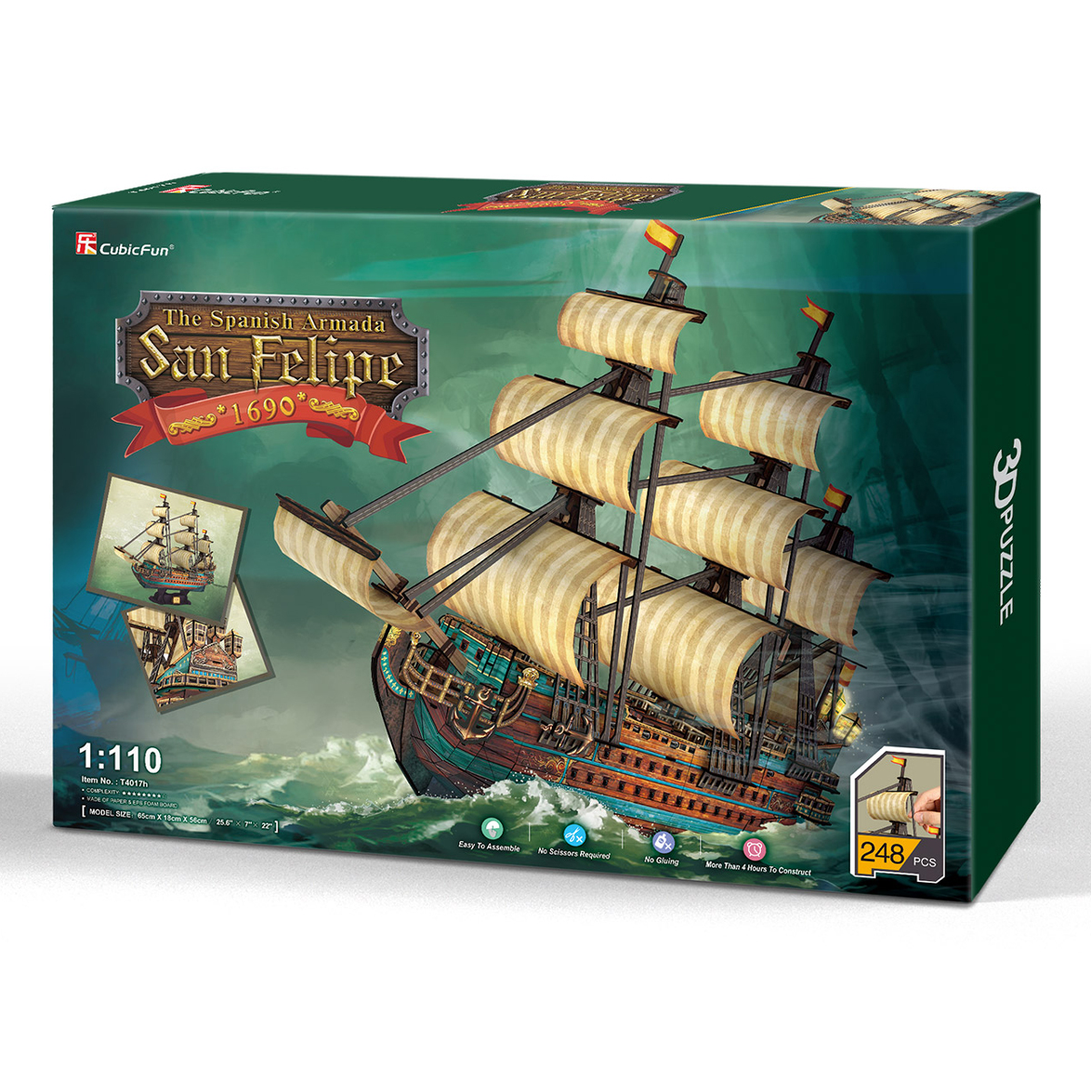 3D пазлы от лидирующей инновационной компании CubicFun - высокий уровень детализации, качество самих деталей (детали надежно крепятся между собой без дополнительной фиксации, создавая единую конструкцию), стильный дизайн, а также информационная и образовательная составляющая. 3D пазл испанский военный корабль San Felipe из серии «Корабли» c уровнем сложности 8 из 8. Набор содержит 248 объёмных деталей, а размер готового макета составляет 68 х 18 х 56 см. Серия «Корабли» - это большой ассортимент знаменитых кораблей различных размеров и уровней сложности. В комплекте 3D пазл с детальной инструкцией по сборке. 3D пазлы от CubicFun - это универсальный товар, удовлетворяющий потребности широкого круга потребителей: новый формат игры для детей, подростков и взрослых через знакомство с известными городами и достопримечательностями, развитие творческих навыков и внимания. Представлены с различными уровнями сложности, подходящими как любителям, так и профессиональным моделистам. 3D пазлы CubicFun станут отличным подарком близкому человеку.