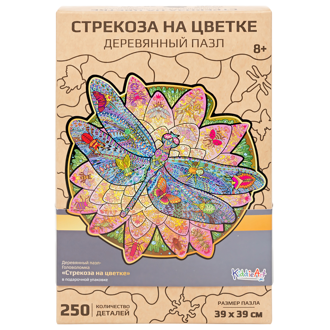 Деревянные фигурные пазлы от KiddieArt – это изображение реальных и сказочных персонажей. Каждый пазл выполнен в оригинальной форме, имеет особый фигурный рез, с помощью которого по мере сборки можно увидеть всю головоломку. Каждый сможет найти для себя пазл по интересам. В ассортименте представлены деревянные пазлы в виде животных, символов, строений и прочее. Подходят для детей от 8 лет и взрослых. Деревянный пазл в виде волшебной яркой стрекозы, сидящей в разноцветном цветке, с интересным запоминающимся детальным орнаментом на крылышках. Необычный дизайн, смелая подача делают головоломку интересной и запоминающейся. Содержит 250 деталей.