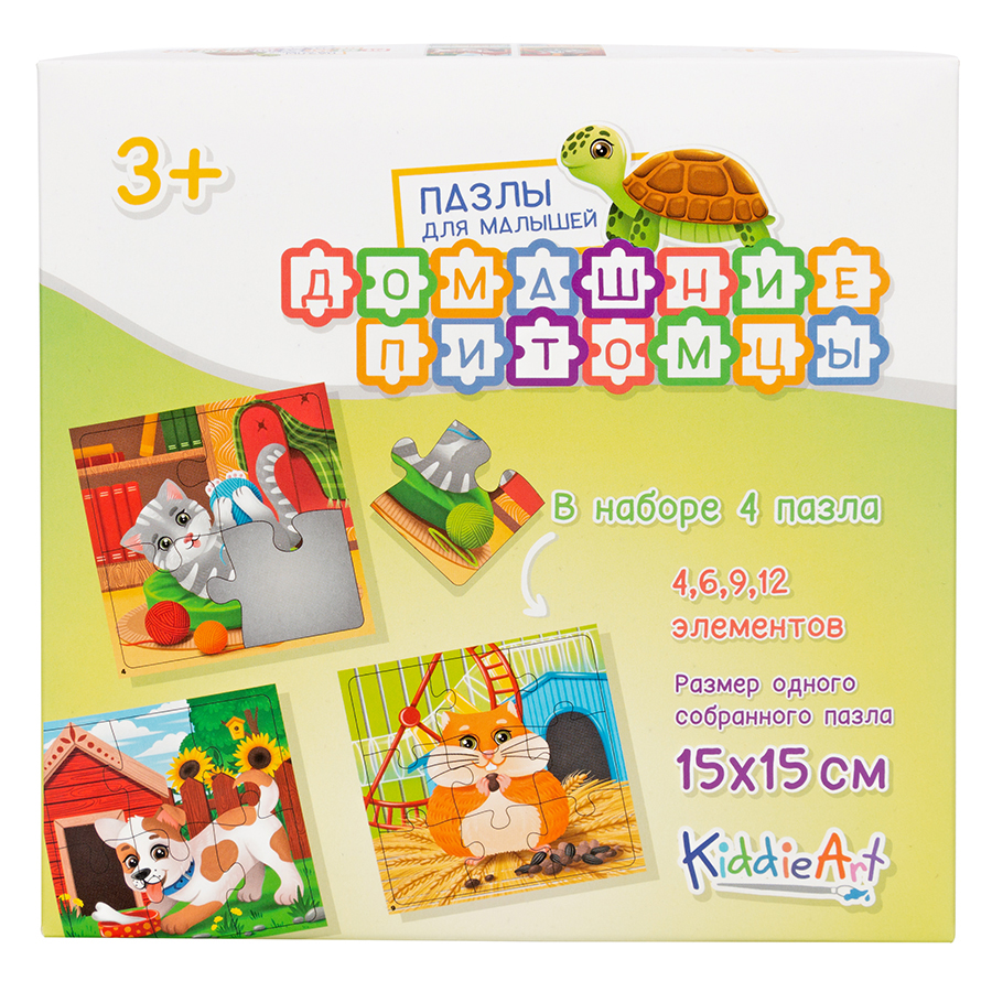 Картонные пазлы для малышей от KiddieArt – это отличный способ изучить окружающий мир. Каждый из 4-х пазлов выполнен в виде картинки с уникальным дизайном того или иного персонажа (времени года, профессии, транспорт и прочее), объединенных единой темой. Размер каждого собранного пазла составляет 15x15 см. Любознательный ребенок очень быстро сможет собрать картонные пазлы и познакомиться с изображенными домашними животными в виде котёнка, щенка, хомячка и черепашки. Подходит для детей от 3-х лет. Содержит 31 деталь.