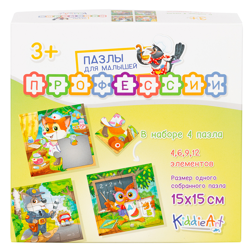 Картонные пазлы для малышей от KiddieArt – это отличный способ изучить окружающий мир. Каждый из 4-х пазлов выполнен в виде картинки с уникальным дизайном того или иного персонажа (времени года, профессии, транспорт и прочее), объединенных единой темой. Размер каждого собранного пазла составляет 15x15 см. Познакомиться с важными профессиями в игровой форме помогут собранные пазлы с изображенными в той или иной специальности животные. Так лиса станет доктором, сорока поваром, сова учителем, а волк полицейским. Подходит для детей от 3-х лет. Содержит 31 деталь.