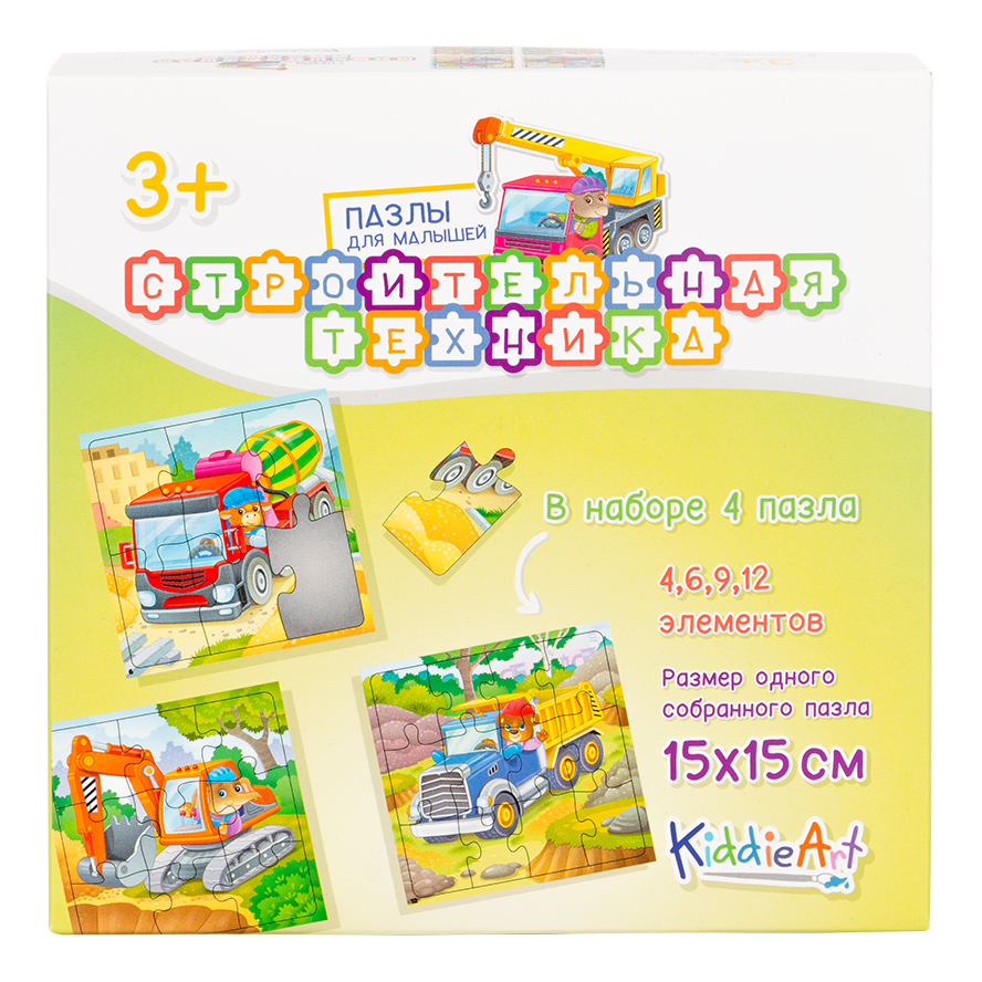 Картонные пазлы для малышей от KiddieArt – это отличный способ изучить окружающий мир. Каждый из 4-х пазлов выполнен в виде картинки с уникальным дизайном того или иного персонажа (времени года, профессии, транспорт и прочее), объединенных единой темой. Размер каждого собранного пазла составляет 15x15 см. 4 картонных пазла с изображением машин строительной техники, каждая из которых поможет в строительстве дорог и зданий: подъёмный кран, бетономешалка, экскаватор, самосвал. Подходит для детей от 3-х лет. Содержит 31 деталь.