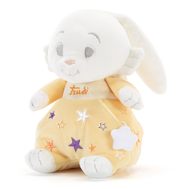 Trudi Baby Star - это серия, посвященная детским мечтам, где каждая деталь игрушек будто рассказывает о самых теплых детских воспоминаниях. Плюшевый зайка в одежде нежно-персикового цвета выполнен в приглушенных пастельных оттенках с мягкими линиями и деталями в виде звезд станет истинным проводником в самые добрые сны малыша. Рекомендуется машинная стирка при 30° без сушки и глажки.