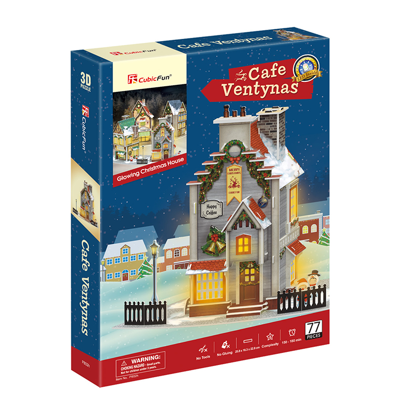 Загляните на кофе в новогоднюю кофейню к деду морозу! Новый 3D Пазл от Cubic Fun имеет яркий, оригинальный дизайн, а также LED-подсветку, которая порадует своим теплым светом ребенка и взрослых. 3Д Пазл имеет LED-подсветку, новогодняя кофейня освещается. Станет прекрасным подарком для детей и взрослых. Новогодняя кофейня имеет праздничный дизайн, здание украшено различными новогодними атрибутами. Пазл развивает мелкую моторику, память, воображение и логику ребенка. Легко собирается без дополнительных инструментов, без ножниц и клея. Изготовлен из качественных материалов. Количество деталей пазла – 77 дет. В набор входит фигурка деда мороза и маленького помощника. Рекомендованный возраст 8+