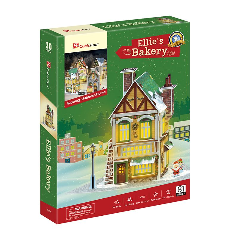 Где можно найти самый вкусный час и сладости? Конечно же в пекарне! Пазл от Cubic Fun приглашает Вас зайти в новогоднюю пекарню и отведать самые вкусные сладости и насладиться теплой атмосферой приближающегося чуда. Пазл имеет LED-подсветку, новогодняя пекарня освещается. 3Д Пазл станет прекрасным подарком для детей и взрослых. Новогодняя пекарня имеет оригинальный новогодний дизайн, выполненный в зелёно-желтом цвете. Пазл развивает мелкую моторику, память, воображение и логику ребенка. Легко собирается без дополнительных инструментов, без ножниц и клея. Изготовлен из качественных материалов. Количество деталей пазла – 81 штука. В набор входит фигурка деда мороза и маленького помощника. Рекомендованный возраст 8+