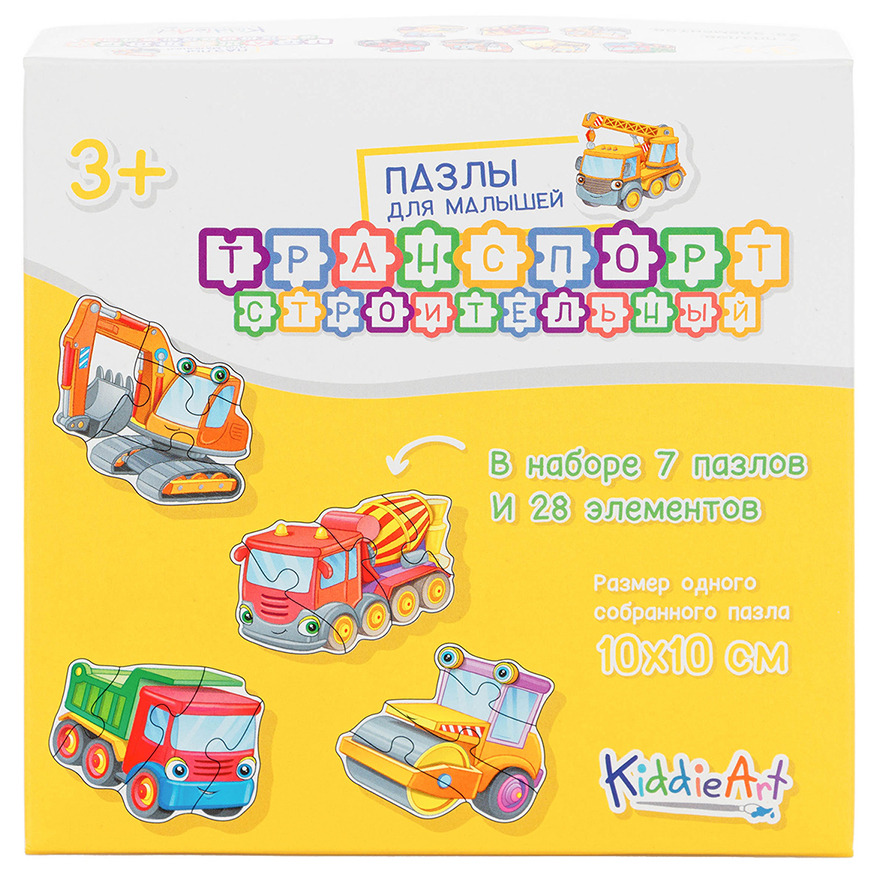 Картонные пазлы для малышей от KiddieArt – это отличный способ ребенку изучить окружающий мир. Каждый пазл выполнен в уникальном дизайне в виде персонажа (животных, фруктов, транспортных средств и прочее), собирается из нескольких деталей, с помощью которых по мере сборки можно увидеть всю головоломку размером 10x10см. Юный строитель будет в восторге от 7 собранных картонных фигурок строительного транспорта в виде бетономешалки, подъемного крана, самосвала, катка, экскаватора, бульдозера, трактора. У каждой машинки добродушные анимированные глазки. Подходит для детей от 3-х лет. Содержит 28 деталей.
