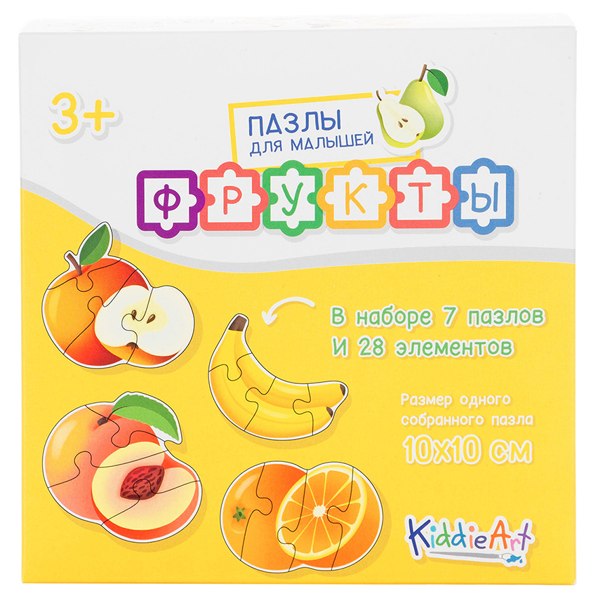 Картонные пазлы для малышей от KiddieArt – это отличный способ ребенку изучить окружающий мир. Каждый пазл выполнен в уникальном дизайне в виде персонажа (животных, фруктов, транспортных средств и прочее), собирается из нескольких деталей, с помощью которых по мере сборки можно увидеть всю головоломку размером 10x10см. Любимые с детства фрукты, они таки полезные и аппетитные, что закрыв глаза можно вспомнить каждый из них. Малыш легко сможет собрать все 7 представленных картонных пазла, назвать, что это за фрукт (лимон, банан, персик, яблоко, слива, груша, апельсин), а если усложнить задачу, то можно выяснить, где они растут. Подходит для детей от 3-х лет. Содержит 28 деталей.