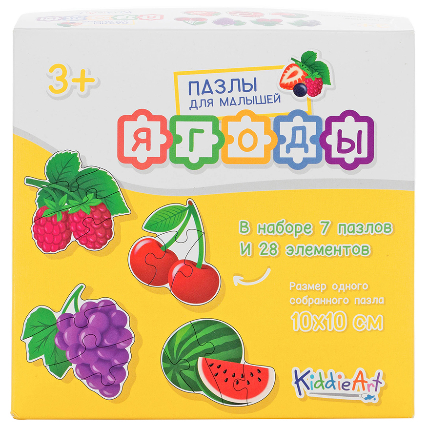 Картонные пазлы для малышей от KiddieArt – это отличный способ ребенку изучить окружающий мир. Каждый пазл выполнен в уникальном дизайне в виде персонажа (животных, фруктов, транспортных средств и прочее), собирается из нескольких деталей, с помощью которых по мере сборки можно увидеть всю головоломку размером 10x10см. Сладкие, кислые, сочные и такие полезные. Ягоды! А какие удивительные цвета, созданные природой! Ребенок с удовольствием соберет 7 картонных пазлов в виде винограда, клубники, граната, арбуза, малины, вишни, черной смородины. Сможет рассказать о своих предпочтениях, ведь, возможно, что-то он видит впервые и захочет попробовать. Подходит для детей от 3-х лет. Содержит 28 деталей.
